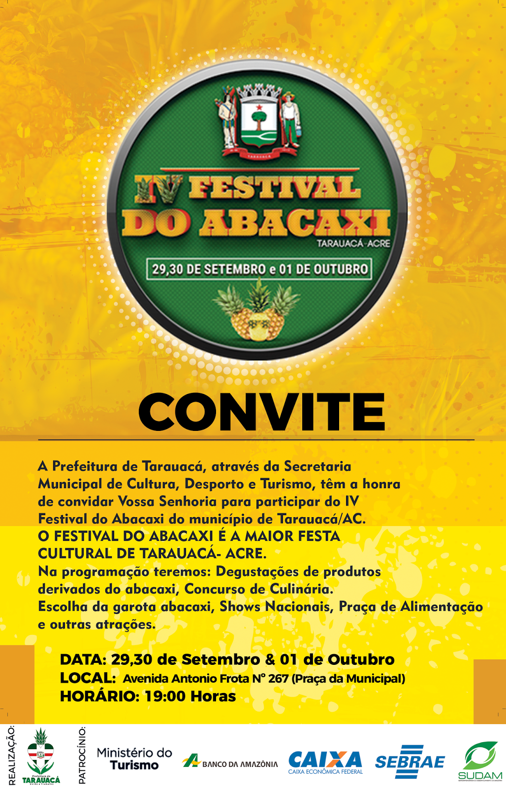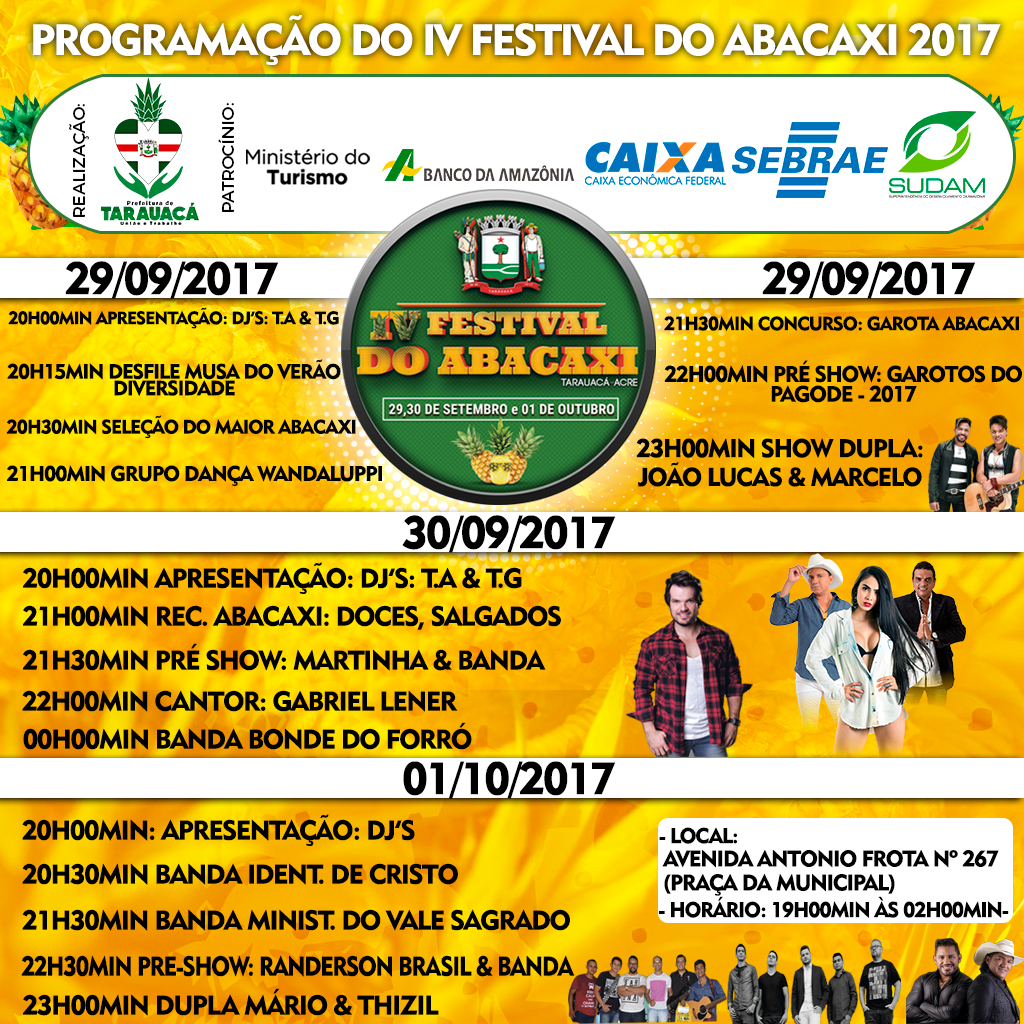 A prefeita Marilete Vitorino determinou que a programação seja voltada para a promoção social das pessoas, principalmente dos produtores. O prestigiado concurso “Garota Abacaxi” vai acontecer em 29 de setembro e as inscrições ainda serão abertas para jovens do município.