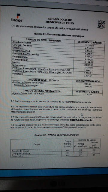 ESTADO DO ACRE MUNICÍPIO DE FEIJÓ 3 Engenheiro Civil 40 01 00 Farmacêutico/Bioquímico 40 01 00 Fisioterapeuta 40 01 00 Fonoaudiólogo 40 01 00 Médico 40 01 00 Nutricionista 40 01 00 Professor Licenciatura Plena Zona Rural (PEDAGOGO)* 40 57 03 Professor Licenciatura Plena Zona Urbana (PEDAGOGO)* 40 04 01 Psicólogo 40 03 00 *Para o cargo de Professor Licenciatura Plena (PEDAGOGO), se não houver aprovação de candidatos no número de vagas para qualquer uma das duas zonas de atuação, poderá a Prefeitura Municipal de Feijó, a seu critério, desde que legalmente autorizada pela legislação vigente e obedecida a ordem de classificação, proceder à contratação de professores aprovados em uma zona para atuar em outra, ou de outros profissionais em educação. Quadro 03 – VAGAS DE NÍVEL TÉCNICO Cargo Carga Horária (horas) Número de Vagas Ampla Concorrênci a Pessoa com Deficiência Técnico de Enfermagem 40 05 1 Auxiliar de Saúde Bucal (ASB) 40 04 0 Quadro 04 – VAGAS DE NÍVEL FUNDAMENTAL COMPLETO** Cargo Carga Horária (horas) Número de Vagas Ampla Concorrência Pessoa com Deficiência Agente Comunitário de Saúde (UBS Dr. José Luiz) 40 01 00 Agente Comunitário de Saúde (UBS Florinda Vieira) 40 01 00 Agente Comunitário de Saúde (UBS Francisca Lima) 40 02 00 Agente Comunitário de Saúde (UBS Maria Alice) 40 01 00 **Os candidatos interessados ao cargo de Agente Comunitário de Saúde, deverão se inscrever para a área onde reside (ÁREAS DE COBERTURA), em conformidade com a Lei Federal 11.350/2006, de 05 de outubro de 2006, conforme demonstrativo no QUADRO 05. QUADRO 05 – ÁREAS DE COBERTURA UNIDADE DE SAÚDE ÁREA COBERTURA / BAIRRO UBS Dr. José Luiz Bairro Genir Nunes UBS Florinda Vieira Bairro Conquista UBS Francisca Lima Bairro Bela Vista UBS Maria Alice Bairro Esperança
