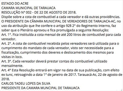 A Câmara de Vereadores de Tarauacá vem por meio deste meio de Comunicação esclarecer sobre a matéria veiculada no “AC24Horas”, nesta quarta-feira, 5 de Agosto, que critica a aprovação da resolução N°002/2018 que Institui a cota mensal de 200 litros de combustível para cada Vereador.