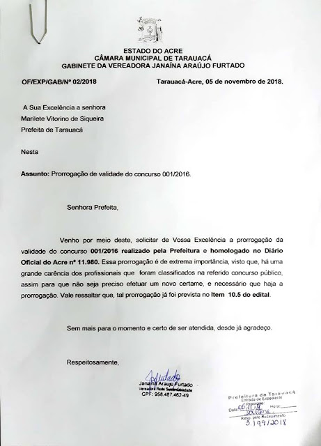 Ainda no ano de 2018, mais precisamente no dia 5 de novembro, a vereadora Janaina Furtado apresentou um documento ao poder executivo, pedindo a prorrogação do concurso. “Eu atendi um pedido das pessoas que estão na lista de espera, pois, elas estavam preocupadas com o encerramento do prazo. Não conto às vezes que subi aquela escada da prefeitura insistindo para que prorrogassem o prazo”, disse Janaina.