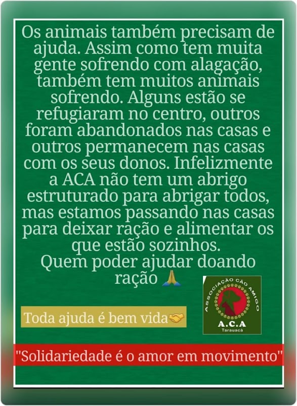 A ONG Associação Cão Amigo que atua na proteção desses animais em Tarauacá, iniciou uma campanha para socorrer, abrigar e alimentar os animais. A ACA mantém um abrigo de animais no Bairro de Copacabana que está lotado de animais em situação de abandono e doentes.