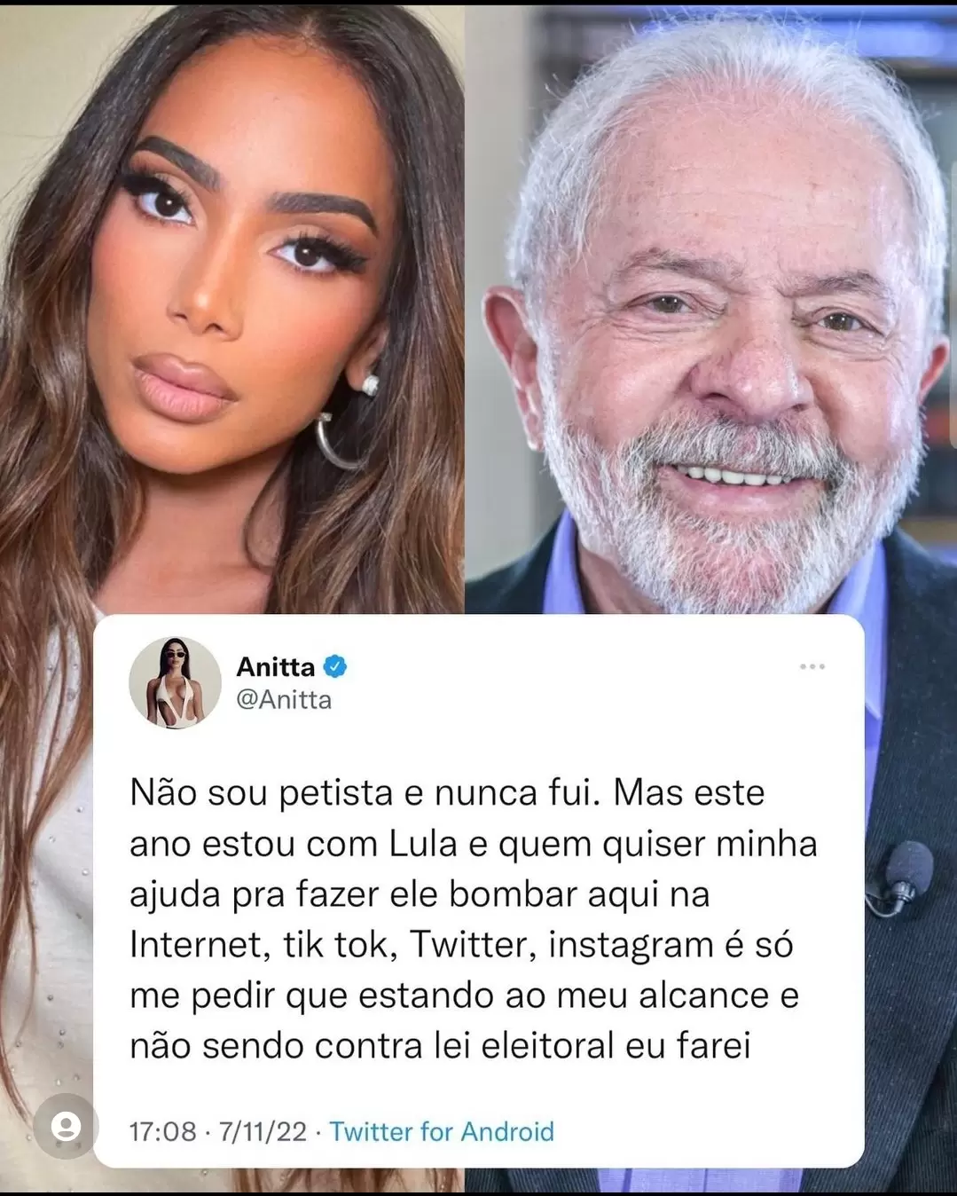 A cantora Anitta declarou que em 2022 votará  no ex-presidente  Lula. Segundo ela, tudo o que ela puder fazer sem ferir a legislação  eleitoral,  fará para ajudar o petista a vencer o pleito.