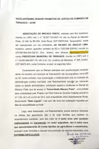 O presidente da Associação do Macaco Preto, Jai Valdeci, ingressou no Ministério Público contra a Prefeitura de Tarauacá, por falta de manutenção no ramal de nome homólogo, cujo logroudoro da acesso a comunidade.