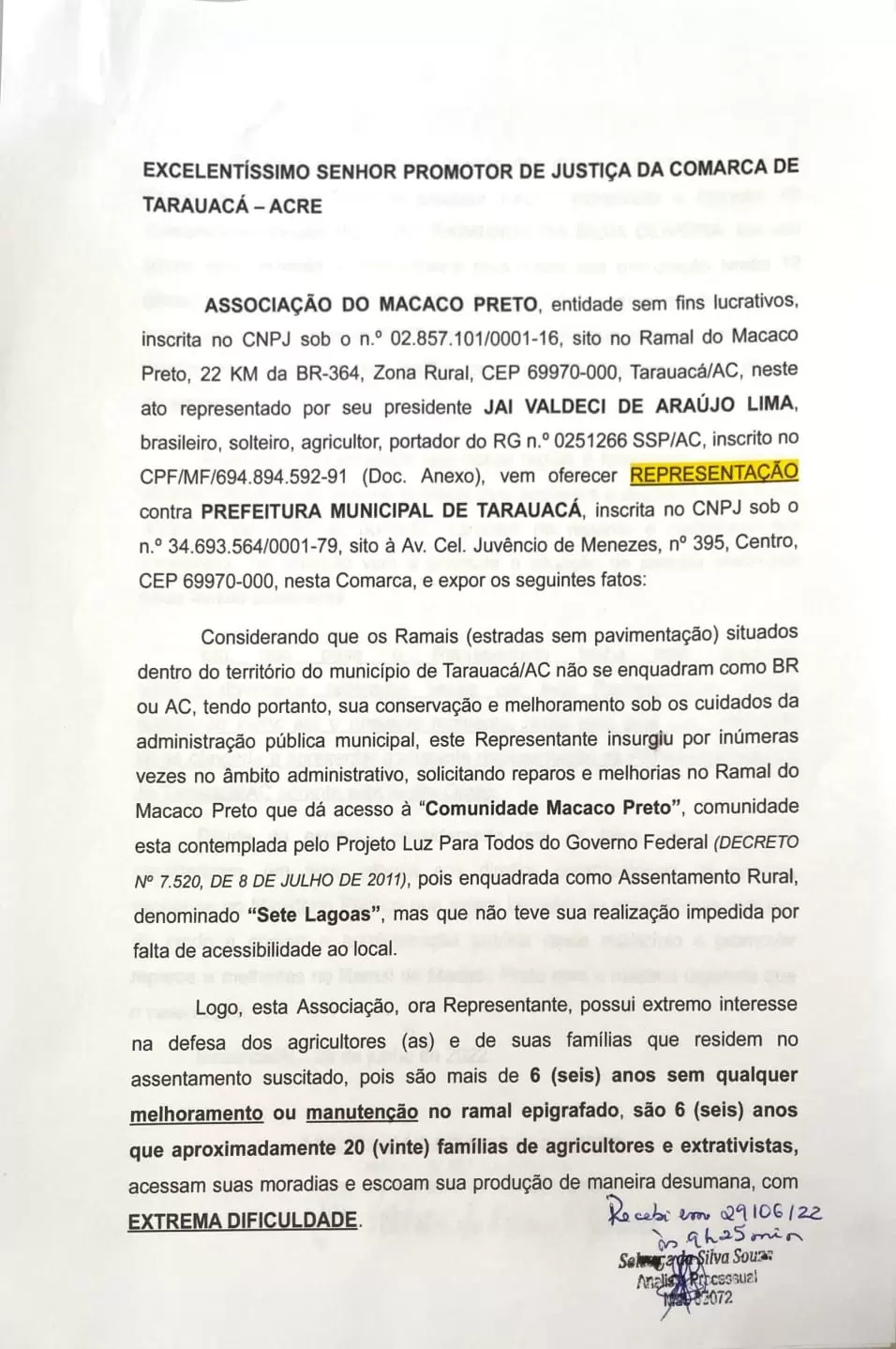 O presidente da Associação do Macaco Preto, Jai Valdeci, ingressou no Ministério Público contra a Prefeitura de Tarauacá, por falta de manutenção no ramal de nome homólogo, cujo logroudoro da acesso a comunidade.