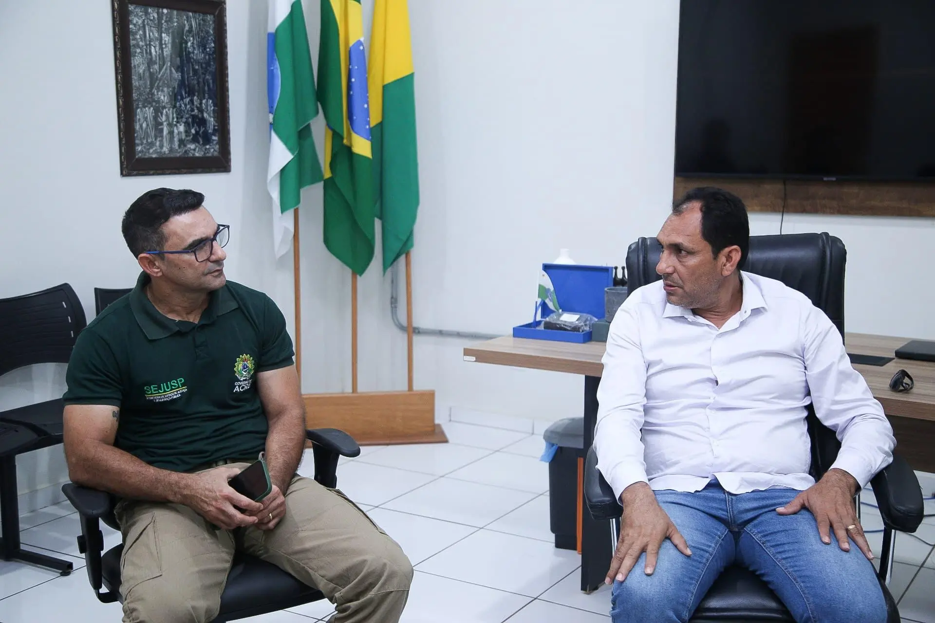 Nesta quarta-feira (30), cumprindo agenda institucional no município de Marechal Thaumaturgo, o secretário-adjunto de Segurança Pública do Estado, Cel. Evandro Bezerra se reuniu col o prefeito Valdelio Furtado, para dialogar sobre as demandas inerentes à segurança no município.