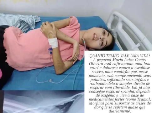 Em publicação nas redes sociais, Jaqueline questiona: “Quanto tempo vale uma vida?” e descreve a realidade cruel enfrentada pela filha, que vive à base de sedativos e com os pulmões comprometidos pela curvatura da coluna. Ela destaca que Maria Luísa fará aniversário no próximo domingo, 27, e o maior presente seria poder passar a data em casa, sem dor e com dignidade.