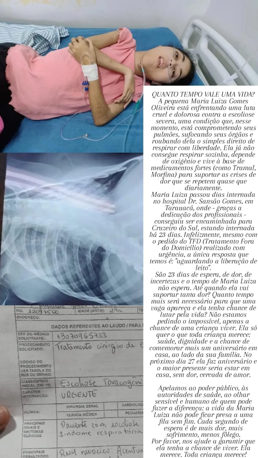 A dona de casa Jaqueline Gomes, natural de Tarauacá, usou as redes sociais para fazer um apelo emocionado ao governo do Acre: sua filha, Maria Luísa Gomes de Oliveira, de 17 anos, enfrenta uma grave escoliose e aguarda há quase um mês por um leito em São Paulo para realizar uma cirurgia de coluna que pode salvar sua vida. A adolescente está internada há 27 dias no Hospital do Juruá, em Cruzeiro do Sul, e depende de oxigênio para respirar, além de fortes analgésicos, como morfina, para suportar as dores constantes.