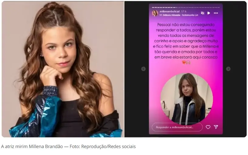 A atriz mirim Millena Brandão, de 11 anos, teve a morte encefálica confirmada às 16h55 desta sexta-feira (2) pelo Hospital Geral de Grajaú, na Zona Sul de São Paulo, onde estava internada desde terça (29) em “estado gravíssimo”. Ela foi figurante de uma novela do SBT chamada “A infância de Romeu e Julieta”.
