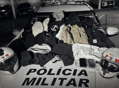 Ao notarem a viatura próxima, os adolescentes e o comparsa abandonaram a sacola cheia de roupas e empreenderam fuga. Entre as peças de vestuário, os policiais identificaram jaquetas, camisas e meias, avaliadas em cerca de R$ 2,8 mil.