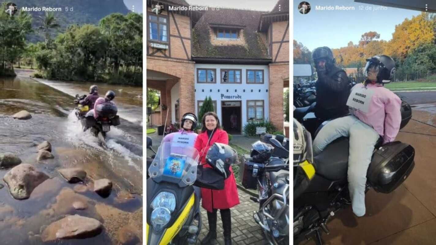 Uma turista provocou muitas risadas nas estradas de Santa Catarina ao levar um “marido reborn” na garupa da moto. Isabella Jonsson, de 30 anos, saiu do Mato Grosso do Sul com um grupo de amigos motociclistas. O companheiro, porém, não pôde acompanhá-la por causa do trabalho. Aí ela decidiu improvisar para não perder a viagem. Tudo no maior clima de brincadeira, conta.