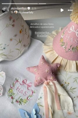 “Detalhes de uma festa delicada e apaixonante”, escreveu Nicole ao mostrar parte da decoração, marcada por flores, borboletas e estrelas em tons suaves como rosa, branco, azul, verde e amarelo.