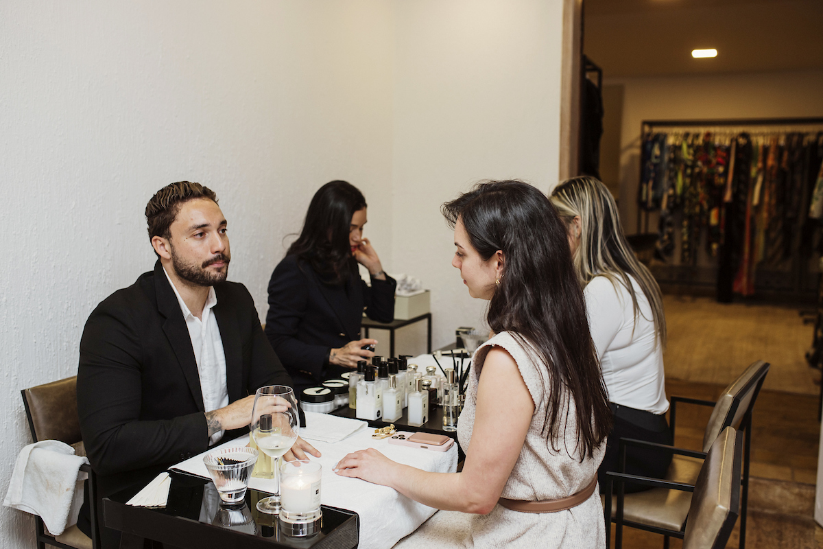 No evento, as convidadas respondiam algumas perguntas para os consultores, que separavam fragrâncias de acordo com as respostas e, em seguida, faziam uma massagem nas mãos delas.
