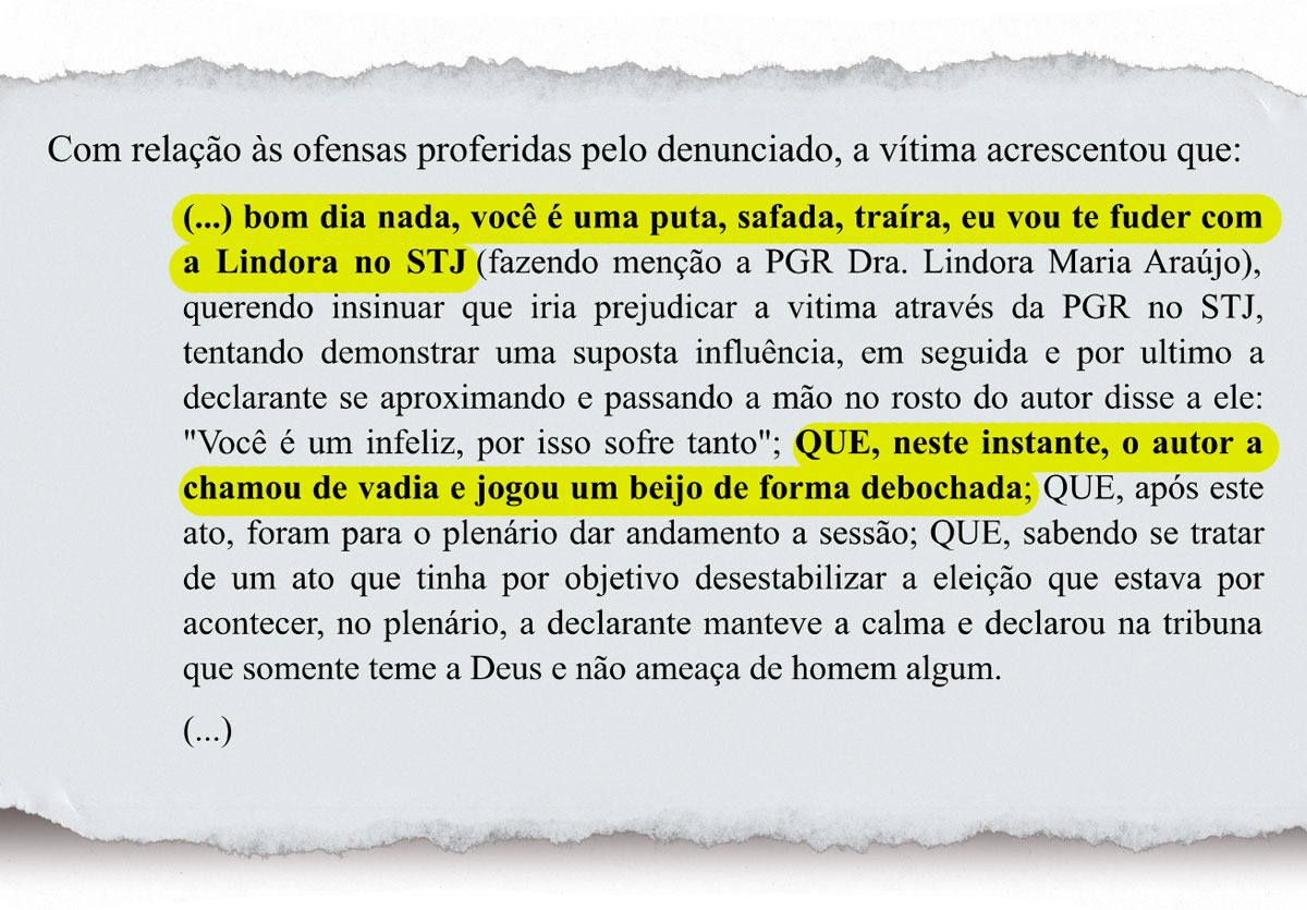 Além dos xingamentos, Moutinho também teria insinuado que prejudicaria a vítima por meio da Procuradoria-Geral da República (PGR). ”Eu vou te fuder com a Lindora no STJ”, teria dito em referência à ex-vice-procuradora-geral da República Lindora Araújo, que, hoje, atua na Corte.
