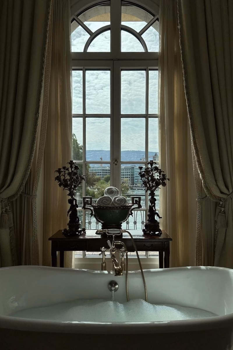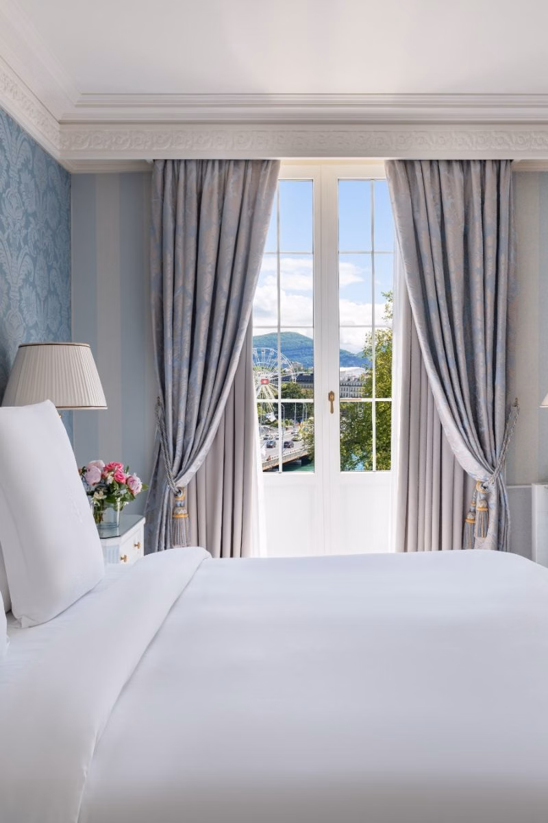 Já os quartos e suítes, projetados pelo renomado designer de interiores francês Pierre-Yves Rochon, exalam sofisticação. A Royal Suite é uma ode a Versailles, com janelas para o Lago de Genebra e o banheiro principal envolto em mármore.