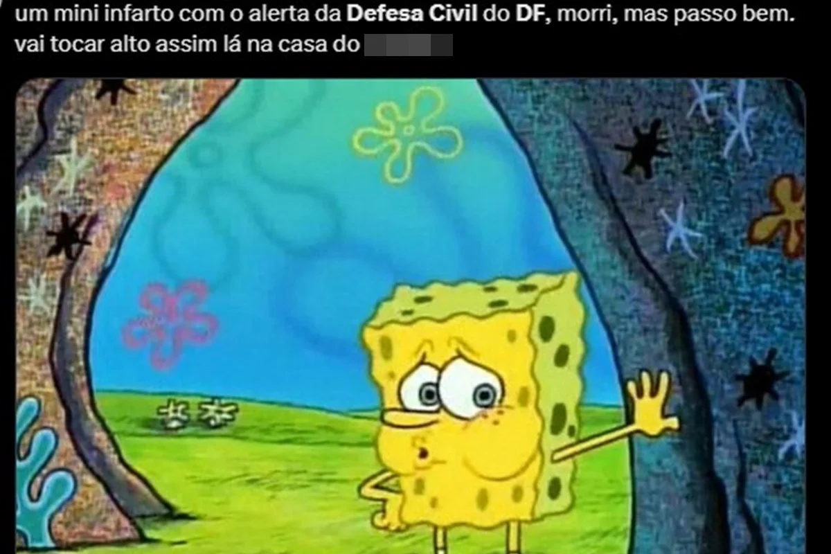 O alerta sonoro gerado pela nova ferramenta da Defesa Civil, o Defesa Civil Alerta (DCA), surpreendeu e assustou a população do Distrito Federal nesse sábado (27/9). Nas redes, brasilienses compartilharam a experiência e estão distribuindo memes para ilustrar o pavor momentâneo.