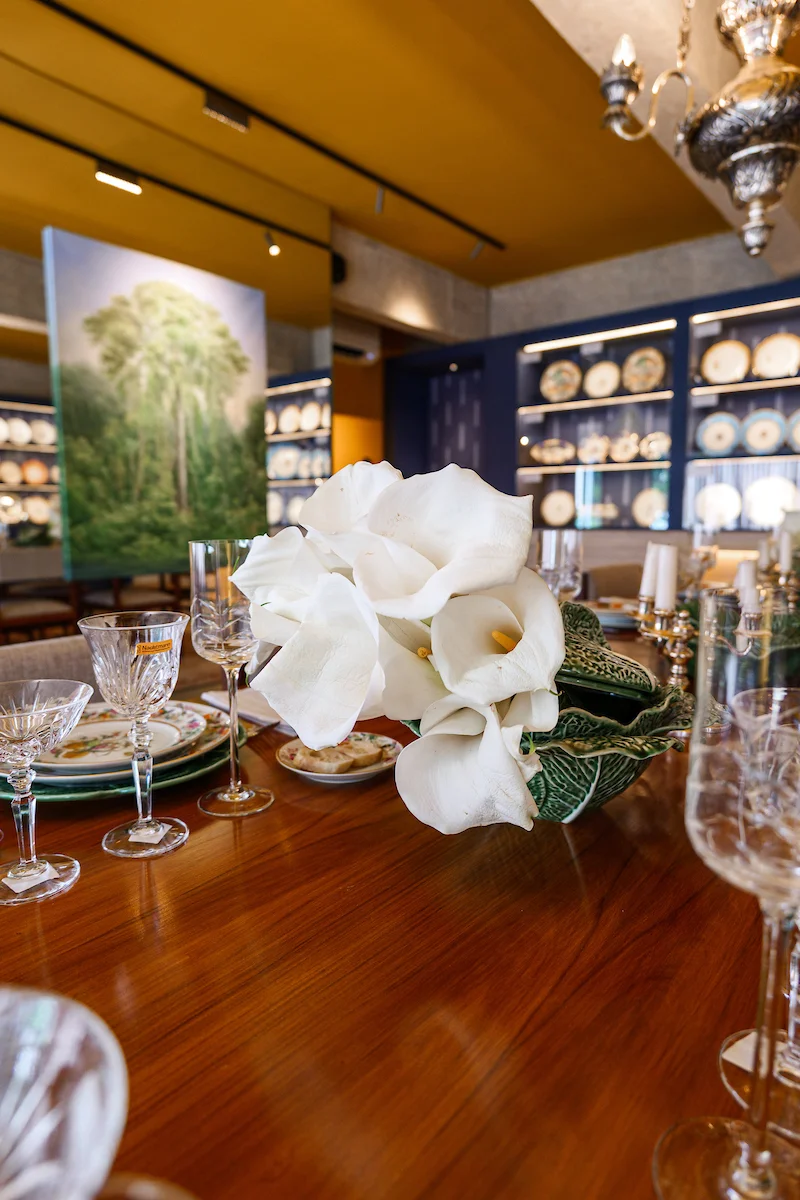 A decoração tanto do espaço na CASACOR quanto no evento na Galeria Mercato levou a assinatura de Rodrigo Resende, do Magia das Flores. Para adornar os ambientes, o especialista elegeu copos-de-leite e folhas de palmeira leque. De acordo com Valéria Álvares, da Vista Alegre, a proposta era montar uma mesa de jantar unindo os pilares memória afetiva e ligação entre Brasil-Portugal.