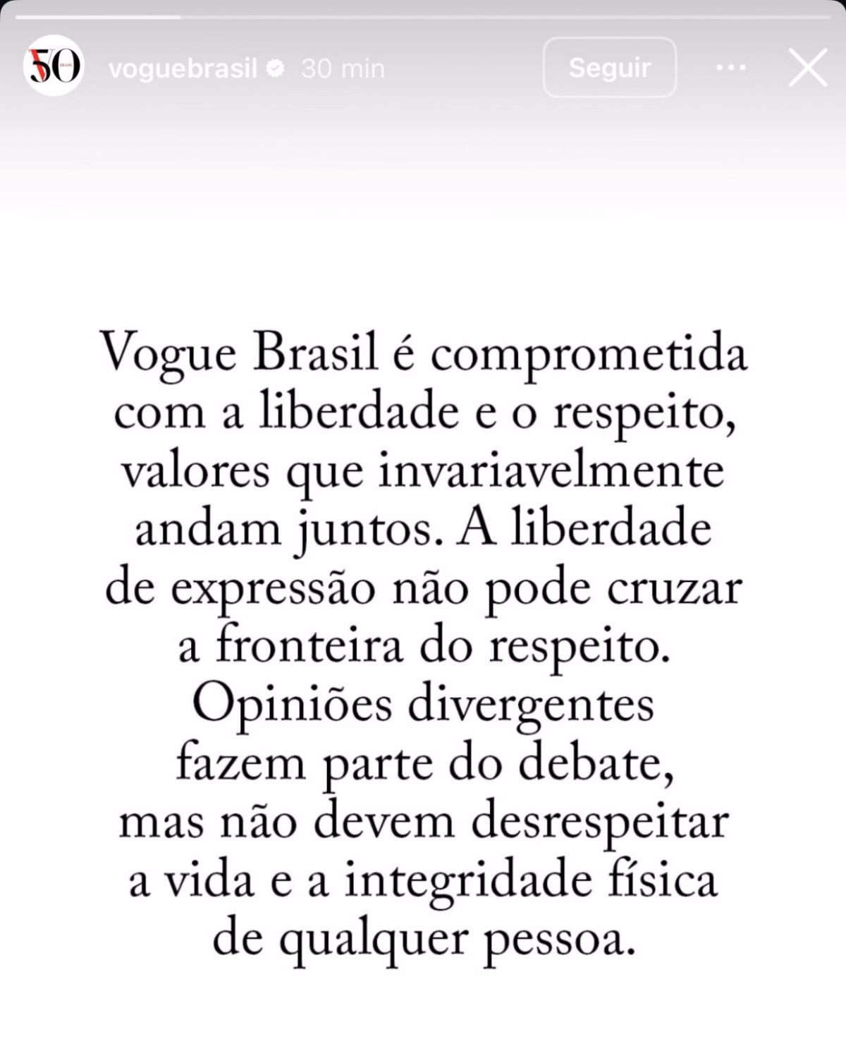 Em uma publicação posterior, Nikolas compartilhou um posicionamento atribuído à revista. “A Vogue Brasil é comprometida com a liberdade e o respeito, valores que invariavelmente andam juntos. A liberdade de expressão não pode cruzar a fronteira do respeito. Opiniões divergentes fazem parte do debate, mas não devem desrespeitar a vida e a integridade física de qualquer pessoa”, diz o texto.