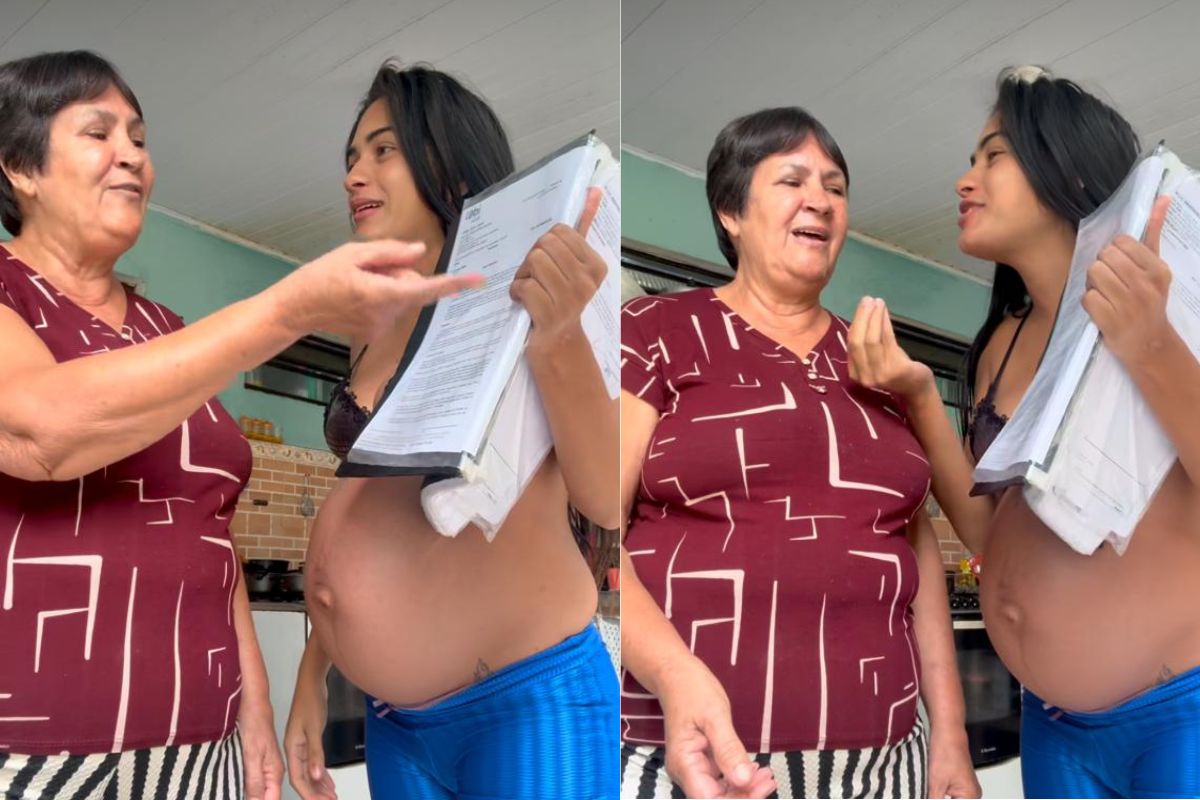 Em seguida, Thielly aparece ao lado da avó, segurando o exame, rindo e questionando a senhora. “Como que você errou, ‘vó’? Está escrito aqui, bem claro, que é menina”. Com uma expressão divertida, a avó explica: “Achei que ‘feminina’ era menina e ‘feminino’ era homem, não é?”.