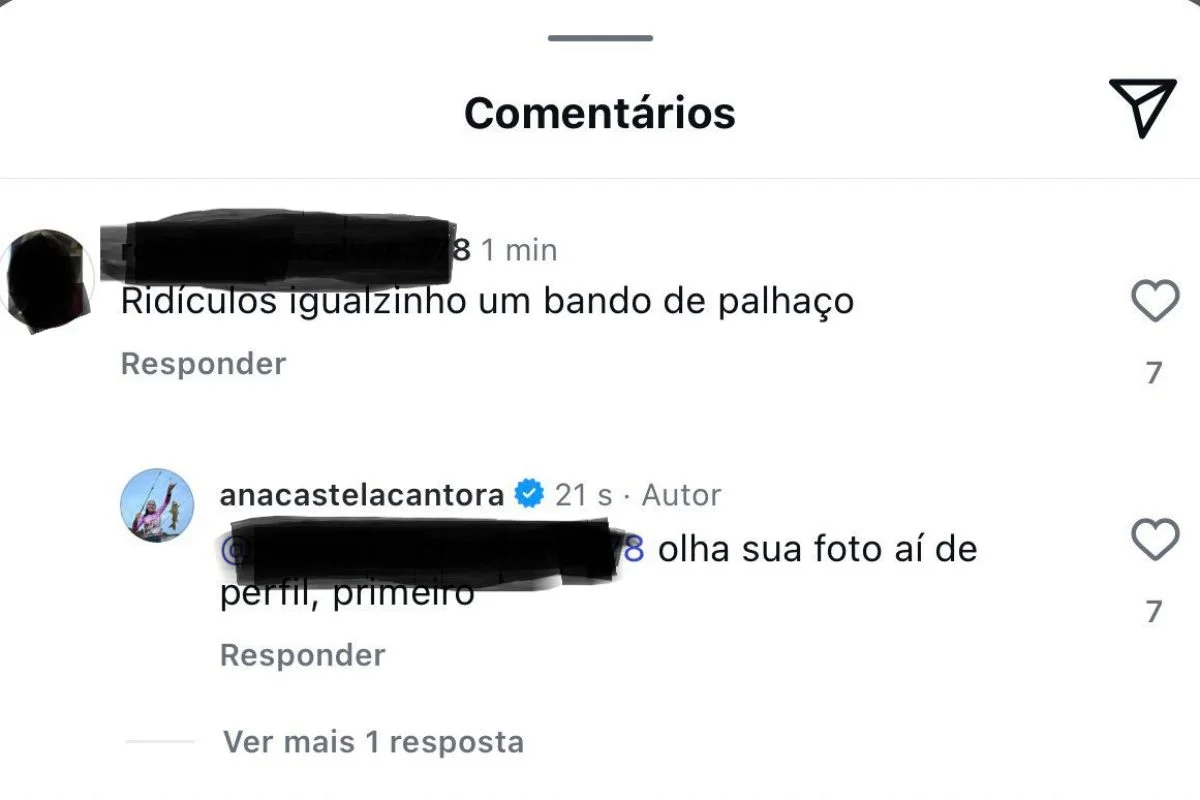 Em tom irônico, Ana Castela respondeu na lata: “Olha a sua foto de perfil aí primeiro”, zombando da seguidora.