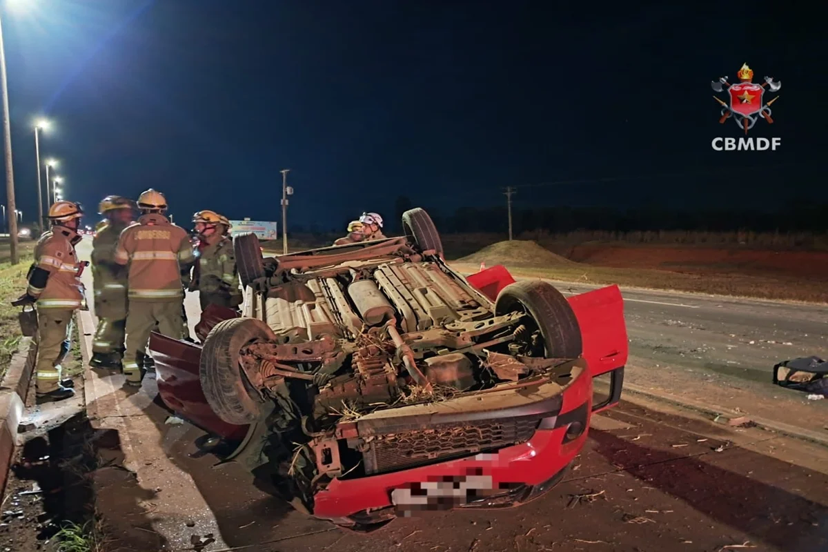 Um Fiat Mobi, de cor vermelha, colidiu com um poste e capotou às 1h45, no sentido Santa Maria. O motorista, preso pelo cinto de segurança, estava com sinais instáveis e foi transportado para a unidade de saúde mais próxima. Não há informações sobre o estado de saúde atualizado do homem.