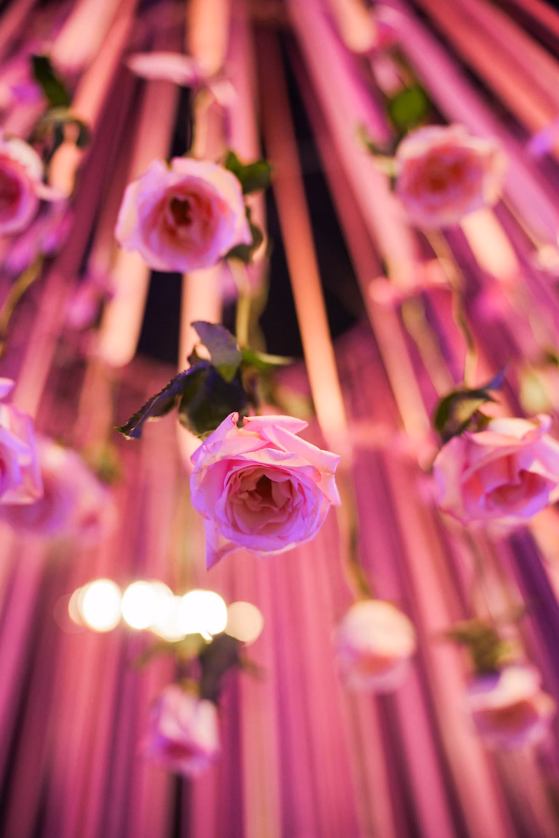 Rosas pendiam do teto, trazendo uma atmosfera romântica à festa