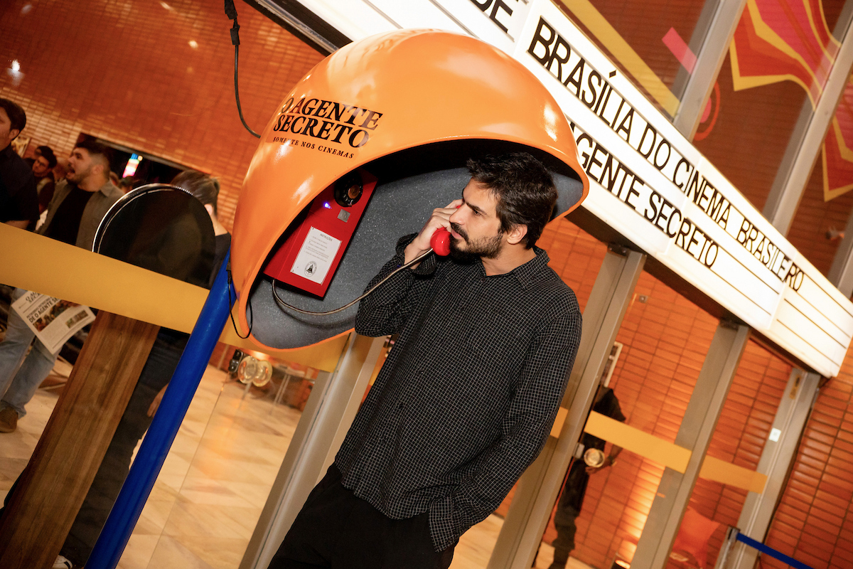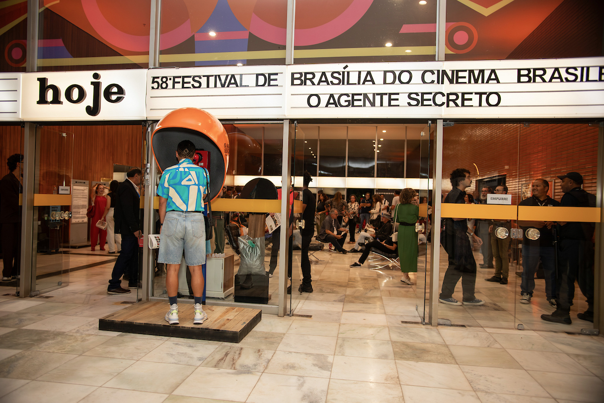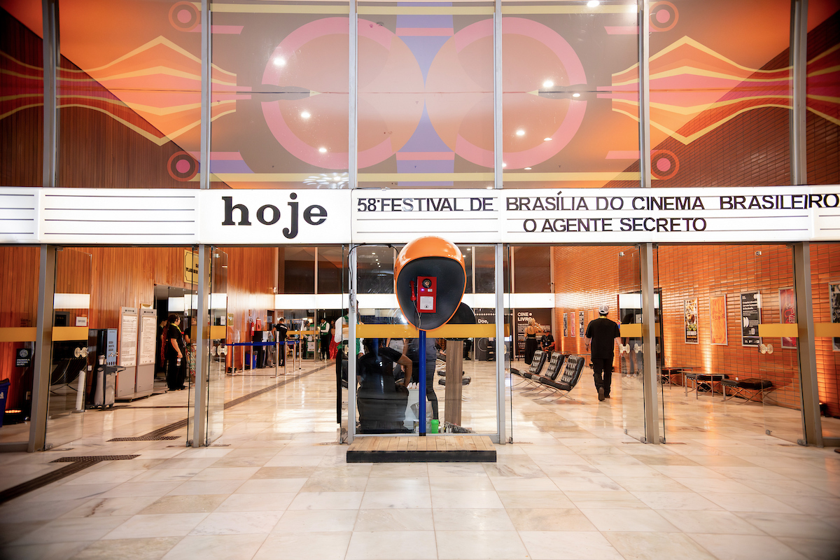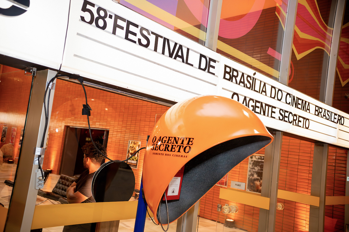 Além do tradicional letreiro que indicava a realização do 58º Festival de Brasília do Cinema Brasileiro e o título de O Agente Secreto, a entrada do Cine Brasília ganhou um adereço especial, no caso, o orelhão no tom alaranjado igual ao do pôster do filme, protagonizado por Wagner Moura. O modelo de telefone e a edição especial de um jornal ambientaram o público para a sessão do longa-metragem, deixando todos mais ansiosos para assistir à produção.