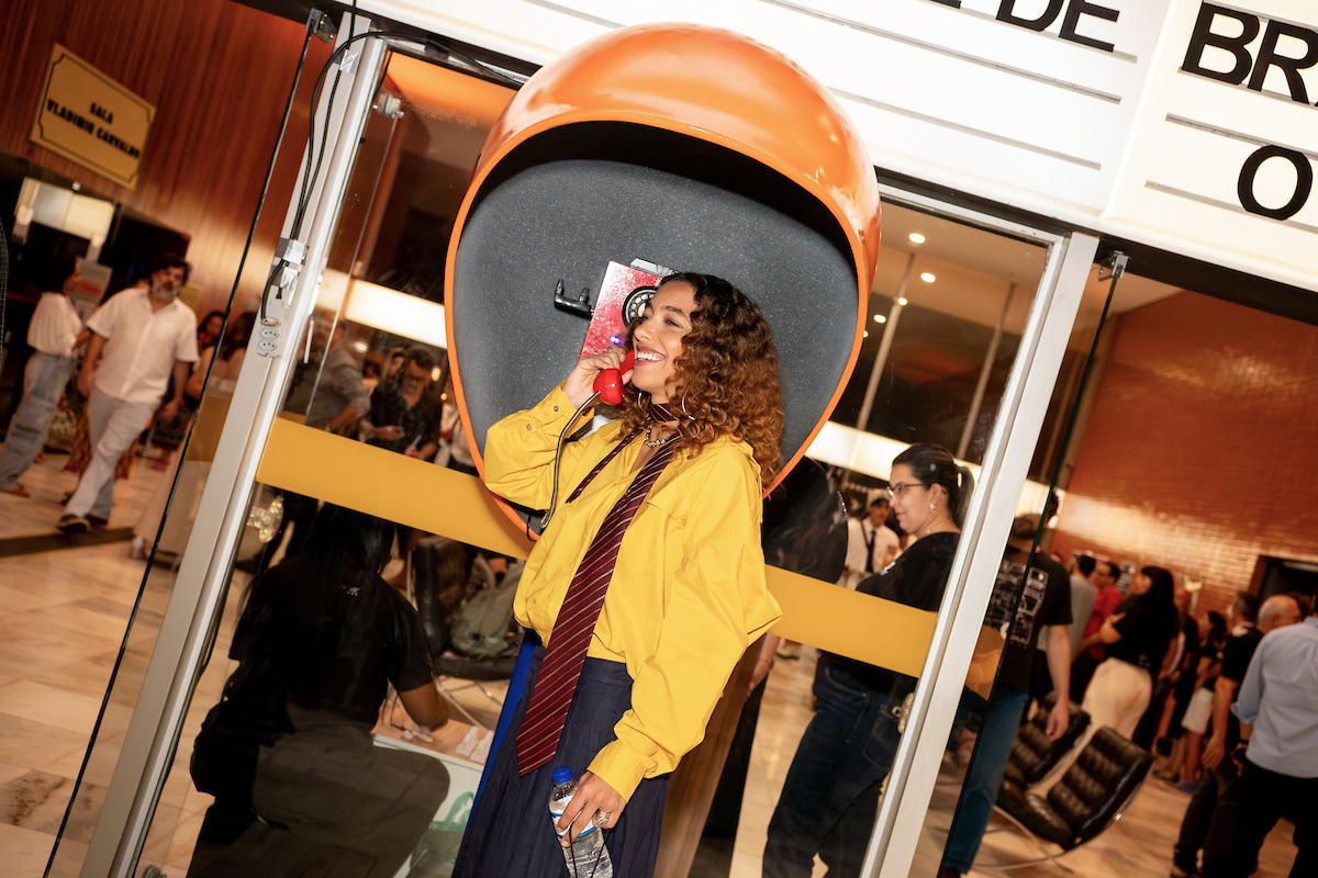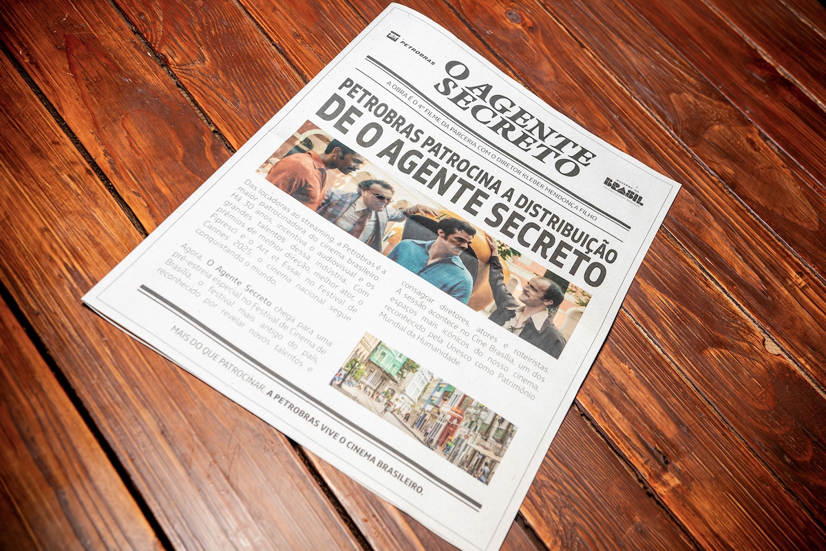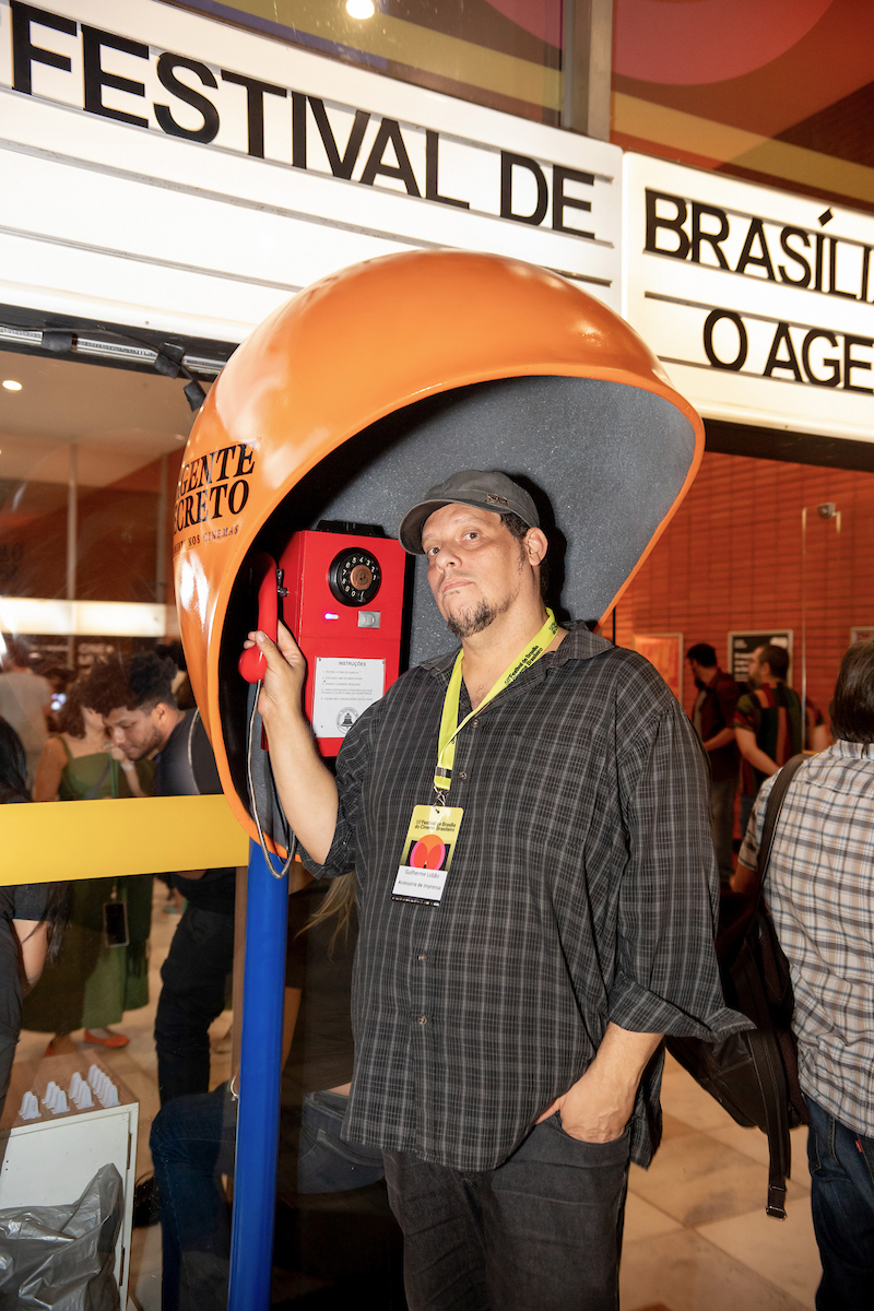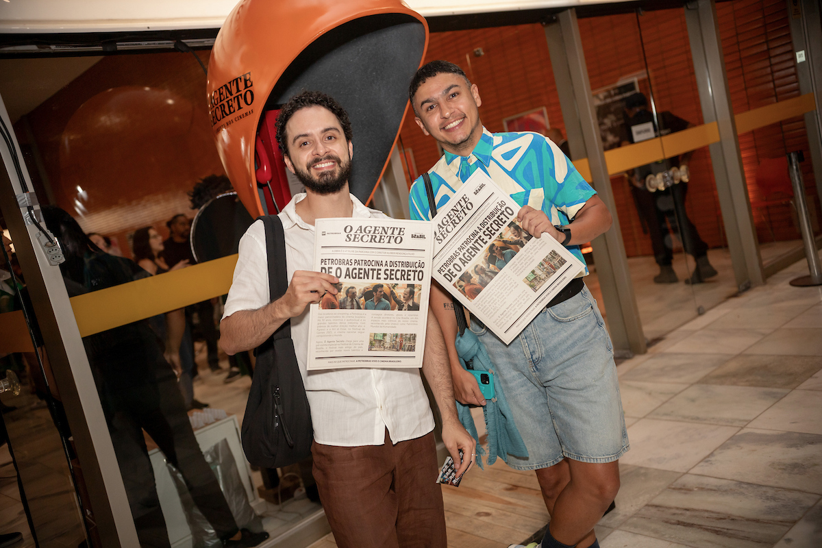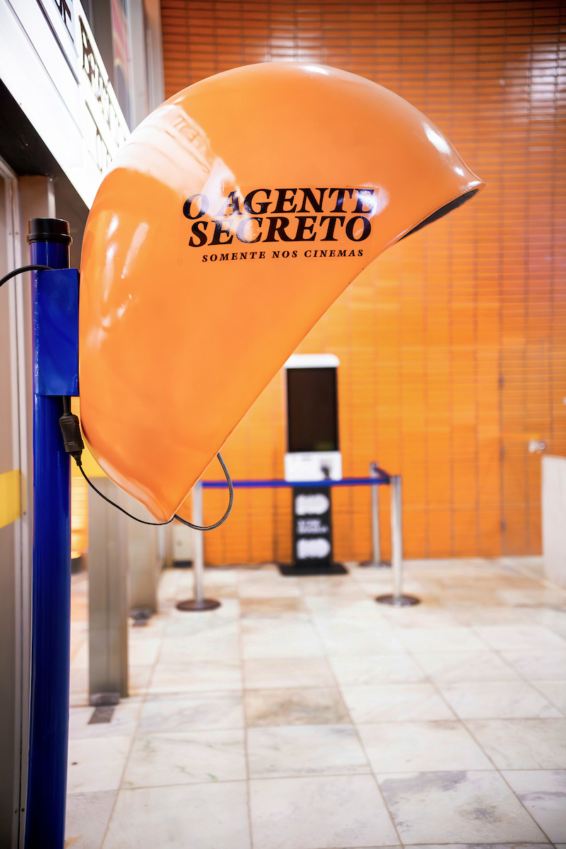 Além do tradicional letreiro que indicava a realização do 58º Festival de Brasília do Cinema Brasileiro e o título de O Agente Secreto, a entrada do Cine Brasília ganhou um adereço especial, no caso, o orelhão no tom alaranjado igual ao do pôster do filme, protagonizado por Wagner Moura. O modelo de telefone e a edição especial de um jornal ambientaram o público para a sessão do longa-metragem, deixando todos mais ansiosos para assistir à produção.