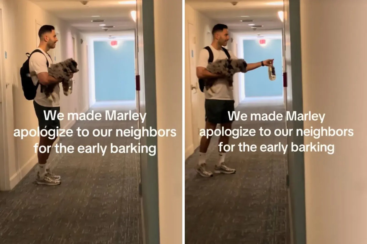 Um vídeo publicado no TikTok, mostra o tutor de Marley pegando o filhote no colo e levando o cachorro até a porta da frente do vizinho, o homem tem ainda uma garrafa de vinho na mão. Na esperança de criar um “bom menino”, o casal queria que Marley “se desculpasse” por todos possíveis transtornos da madrugada causados por seus latidos.