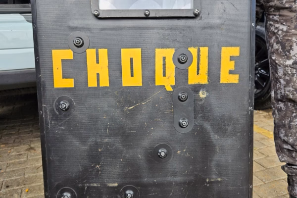 Escudo balístico do Choque danificado após confronto com suspeito de integrar a Sintonia dos 14