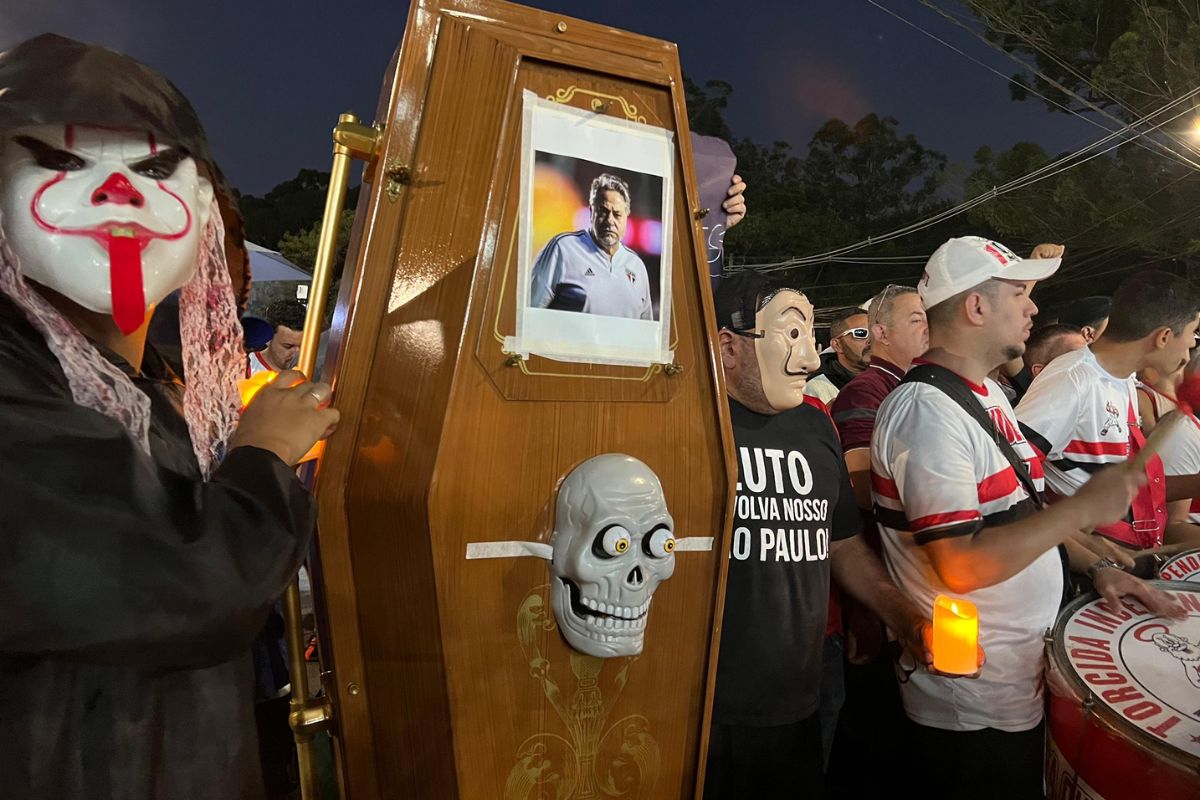 Com caixões estampando o rosto de Casares, presidente do São Paulo e Belmonte, diretor de futebol, os apoiadores criticaram a gestão atual e detonaram o elenco pela eliminação na Libertadores.
