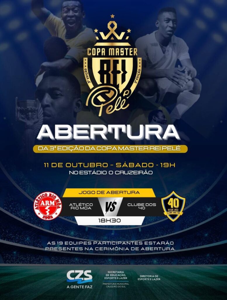 A Prefeitura de Cruzeiro do Sul, por meio da Diretoria de Esportes e Lazer realizará neste sábado, 11, a abertura da 3ª Edição da Copa de Futebol Master Rei Pelé a partir das 18h, no estádio O Cruzeirão. O jogo de abertura será entre as equipes do Atlético Moa e Club dos 40.