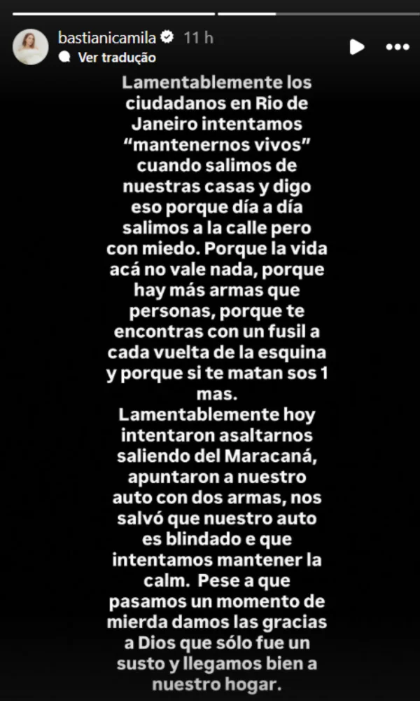 “Infelizmente, os cariocas tentam ‘se manter vivos’ quando saem de casa. Digo isso porque todos os dias saímos às ruas, mas temos medo. Porque a vida aqui não vale nada, porque há mais armas do que pessoas, porque você encontra um fuzil em cada esquina e porque, se te matarem, você é mais um. Infelizmente, hoje tentaram nos assaltar saindo do Maracanã. Apontaram duas armas para o nosso carro. Fomos salvos pelo fato de nosso carro ser blindado e tentamos manter a calma. Mesmo tendo passado por momentos terríveis, agradecemos a Deus que foi só um susto e chegamos em casa em segurança”, desabafou.