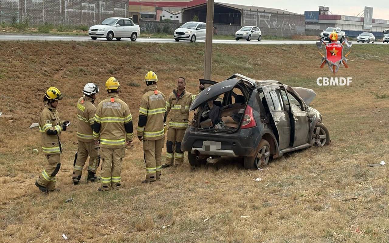 Os bombeiros foram acionados por volta das 16h. No local, as equipes encontraram o automóvel Renault Sandero Stepway preto na área verde da via, com marcas que aparentavam terem sido produzidas por um capotamento.