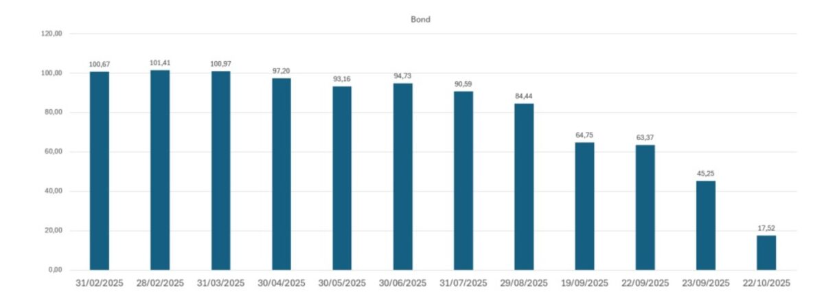 O gráfico abaixo mostra que os bonds passam a perder valor e iniciam uma tendência de baixa em 20 de março de 2025, na mesma data em que COEs são lançados.