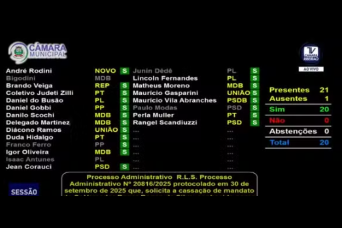 Segundo o requerimento do processo, Bigodini é investigado por quebra de decoro parlamentar — legislação que prevê que qualquer político deve dar o bom exemplo do comportamento, não só em público, como também diante das leis. Durante uma sessão realizada na Câmara Municipal, nessa quarta, 20 parlamentares, dos 21 presentes, votaram a favor da abertura do processo. O presidente da Casa, Isaac Antunes (PL), não vota.