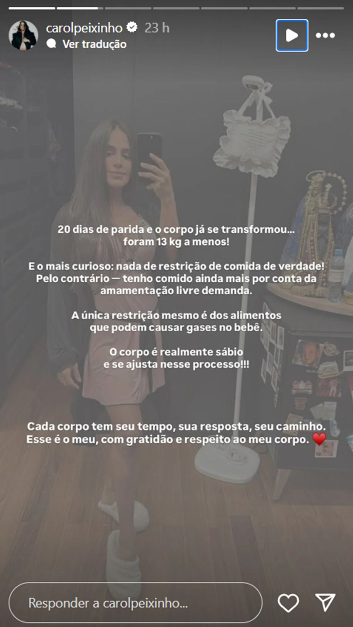 Carol Peixinho ressaltou no Instagram que não tem nenhum tipo de restrição alimentar por causa da amamentação. “Vinte dias de parida [sic] e o corpo já se transformou… foram 13 quilos a menos”, afirmou a influenciadora. “E o mais curioso: nada de restrição de comida de verdade!”, celebrou.
