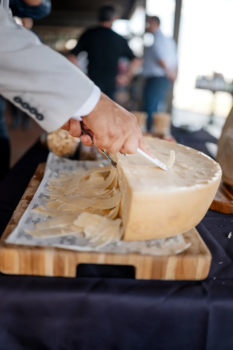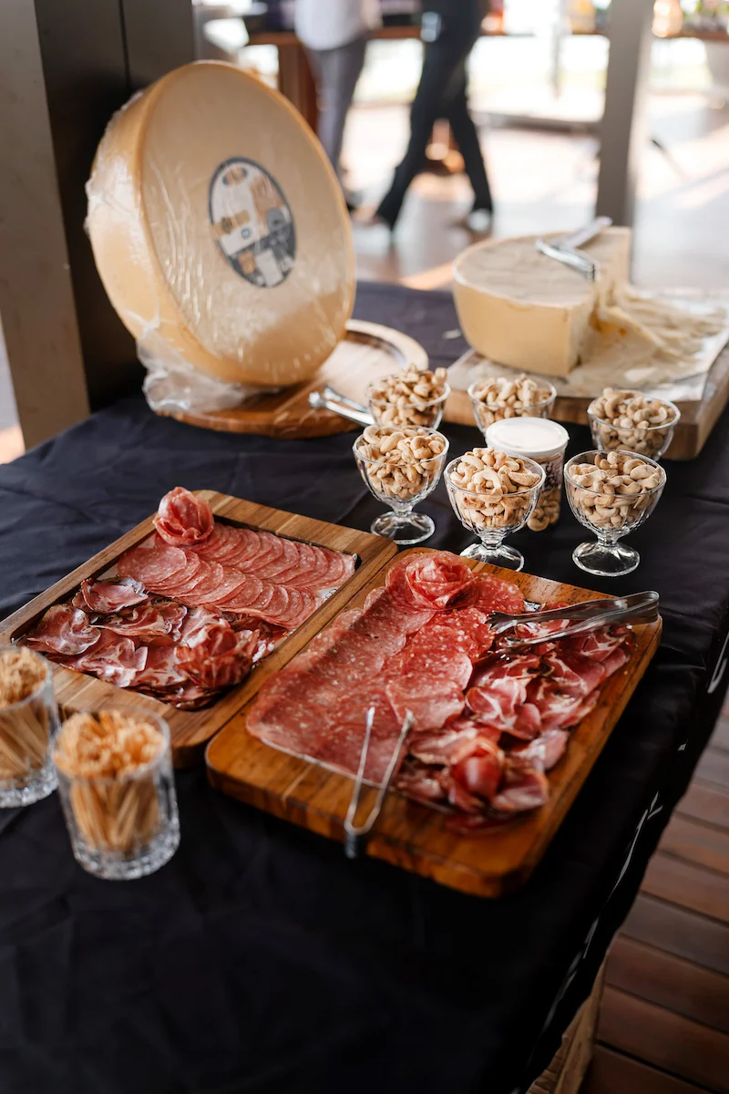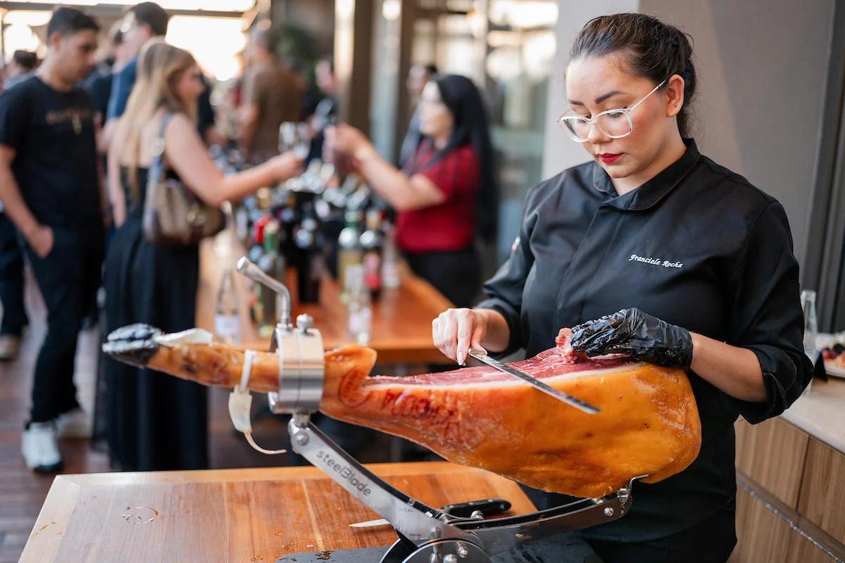 A Del Maipo colocou à disposição uma mesa de charcutaria com queijos premiados e frios selecionados, e um destaque especial: presunto cru pata negra cortado na hora — uma iguaria tradicionalmente servida direto da peça.