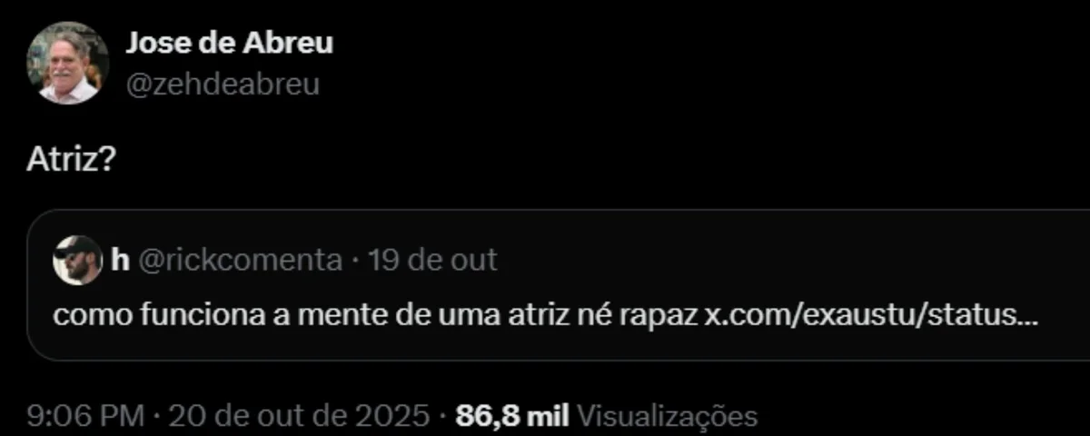 Foi nesse mesmo post que José de Abreu resolveu se manifestar, questionando a profissão da atriz: “Atriz?”.