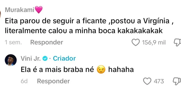 “Eita, parou de seguir a ficante, postou a Virginia literalmente calou a minha boca [risos]”, escreveu a seguidora no post de Vini Jr. Surpreendendo os fãs, o atleta respondeu: “Ela é a mais braba, né?”, acrescentando um emoji piscando o olho seguido de risadas.