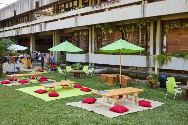 Espaço da Embaixada de Portugal preparado para o evento, com mesas ao ar livre