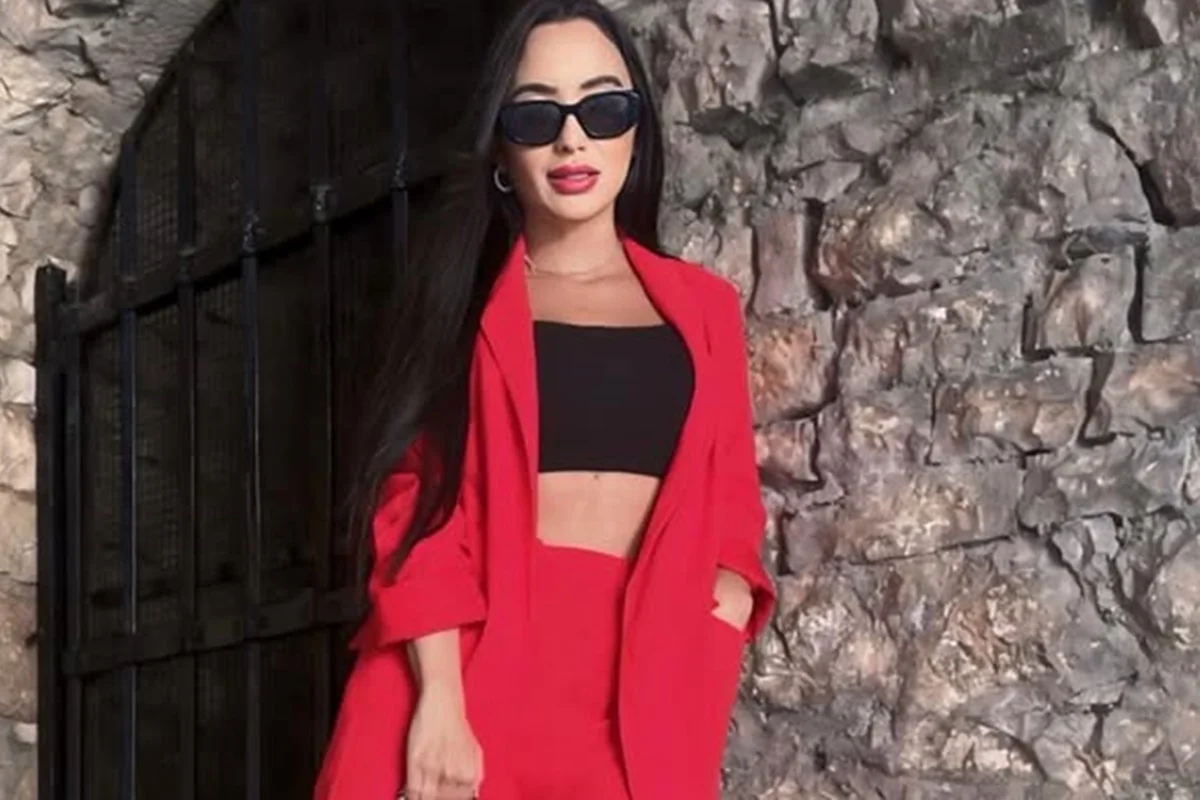 Pablinny Faleiro Pedersoli posa de look preto e vermelho, óculos escuros e cabelos soltos