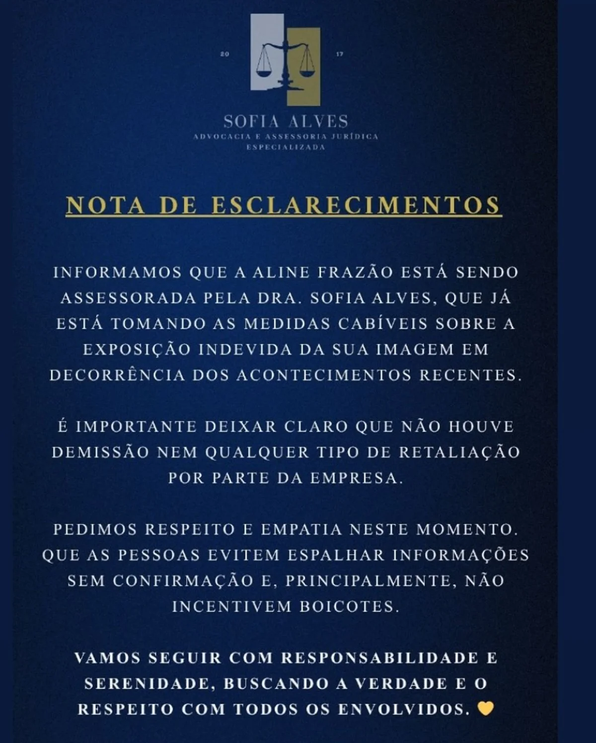 Logo depois, Aline Frazão compartilhou uma nota de esclarecimento, emitida por sua advogada: “Informamos que a Aline Frazão está sendo assessorada pela Dra. Sofia Alves, que já está tomando as medidas cabíveis sobre a exposição indevida da sua imagem em decorrência dos acontecimentos recentes. É importante deixar claro que não houve demissão nem qualquer tipo de retaliação por parte da empresa”, começou o comunicado.