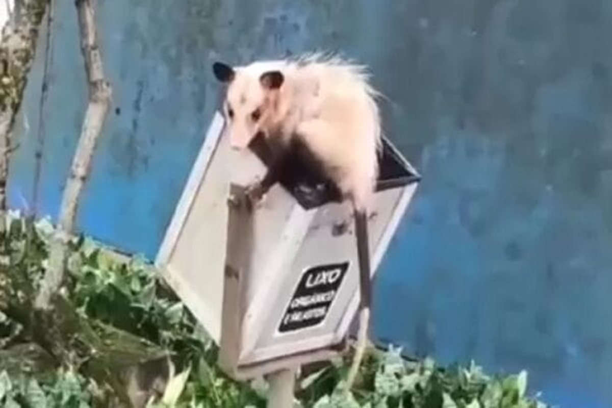 O bicho é da espécie gambá-de-orelha-preta (Didelphis aurita) e apresenta leucismo, uma condição genética rara.