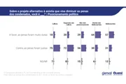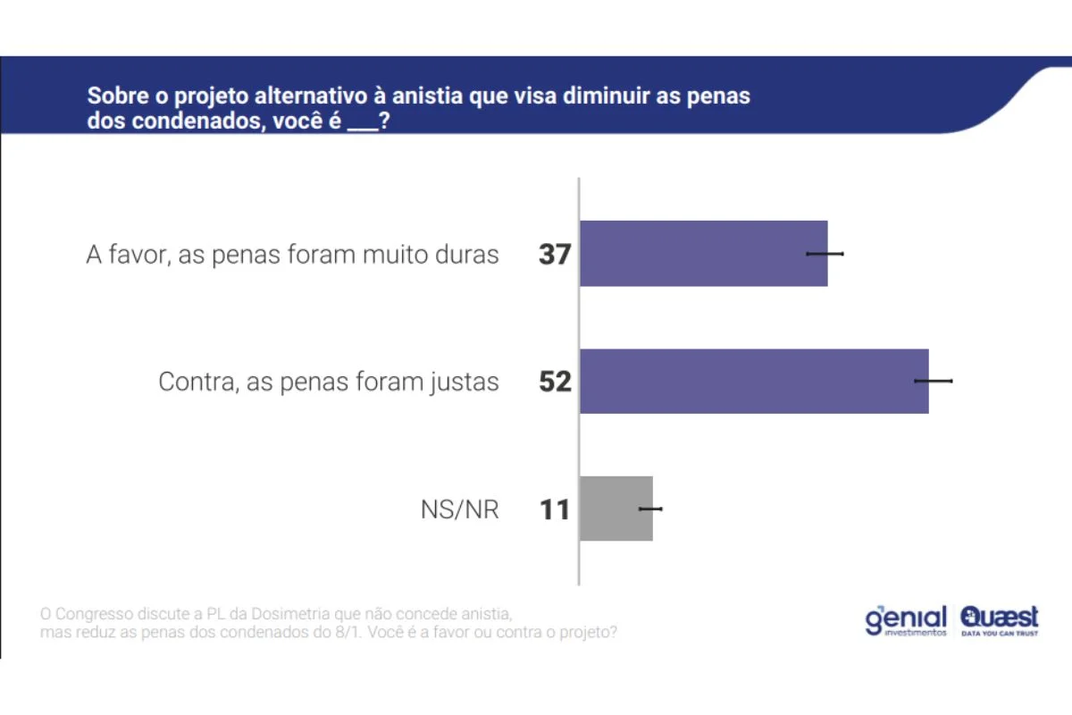 Sobre o PL da Dosimetria, projeto alternativo que visa diminuir as penas dos condenados, 52% se posicionaram contra, 37% a favor e 11% não souberam responder.