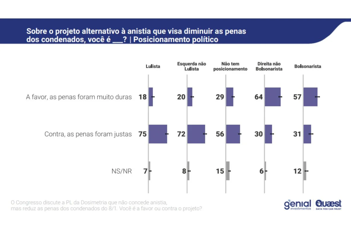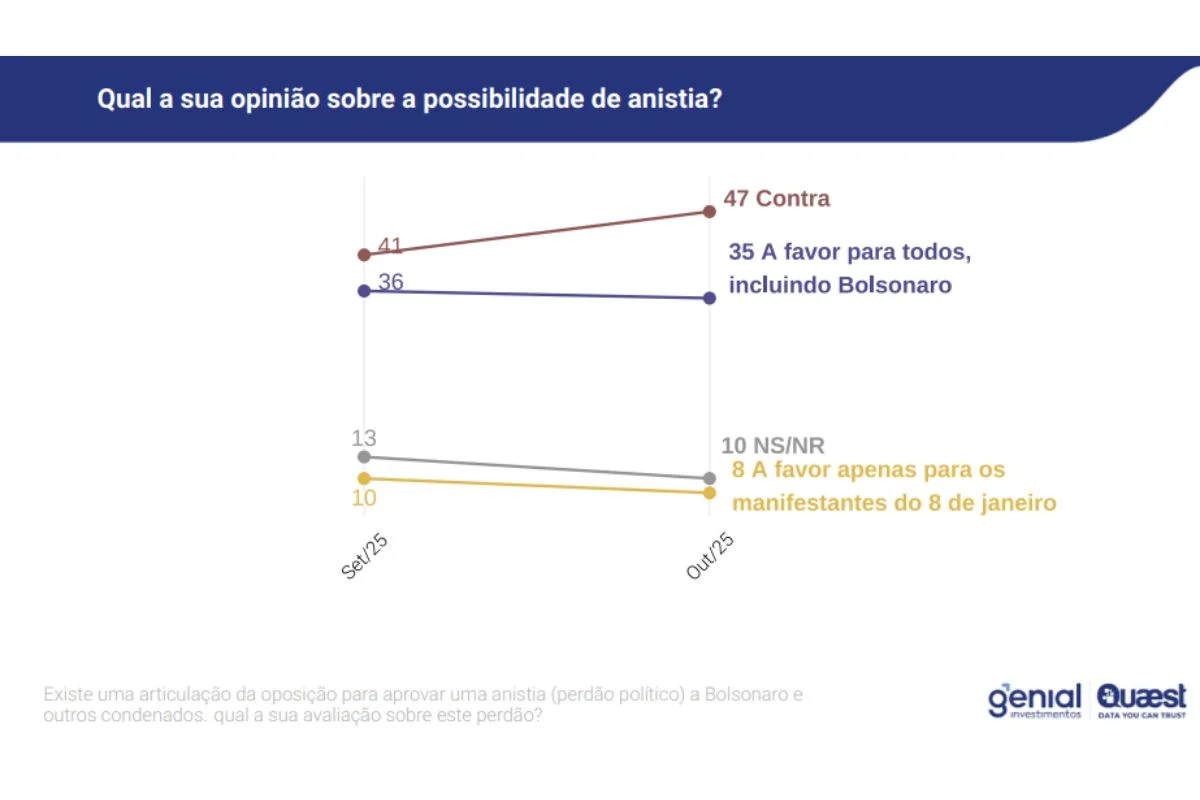 Pesquisa Genial/Quaest Nacional divulgada nesta quarta-feira (8/10) mostra que os entrevistados se posicionaram contra a possibilidade de anistia aos envolvidos nos atos do 8 de Janeiro, o PL da Dosimetria e a PEC da Blindagem.