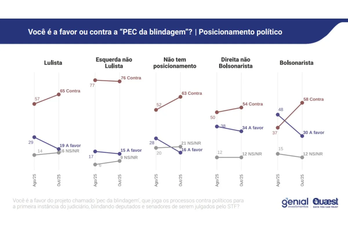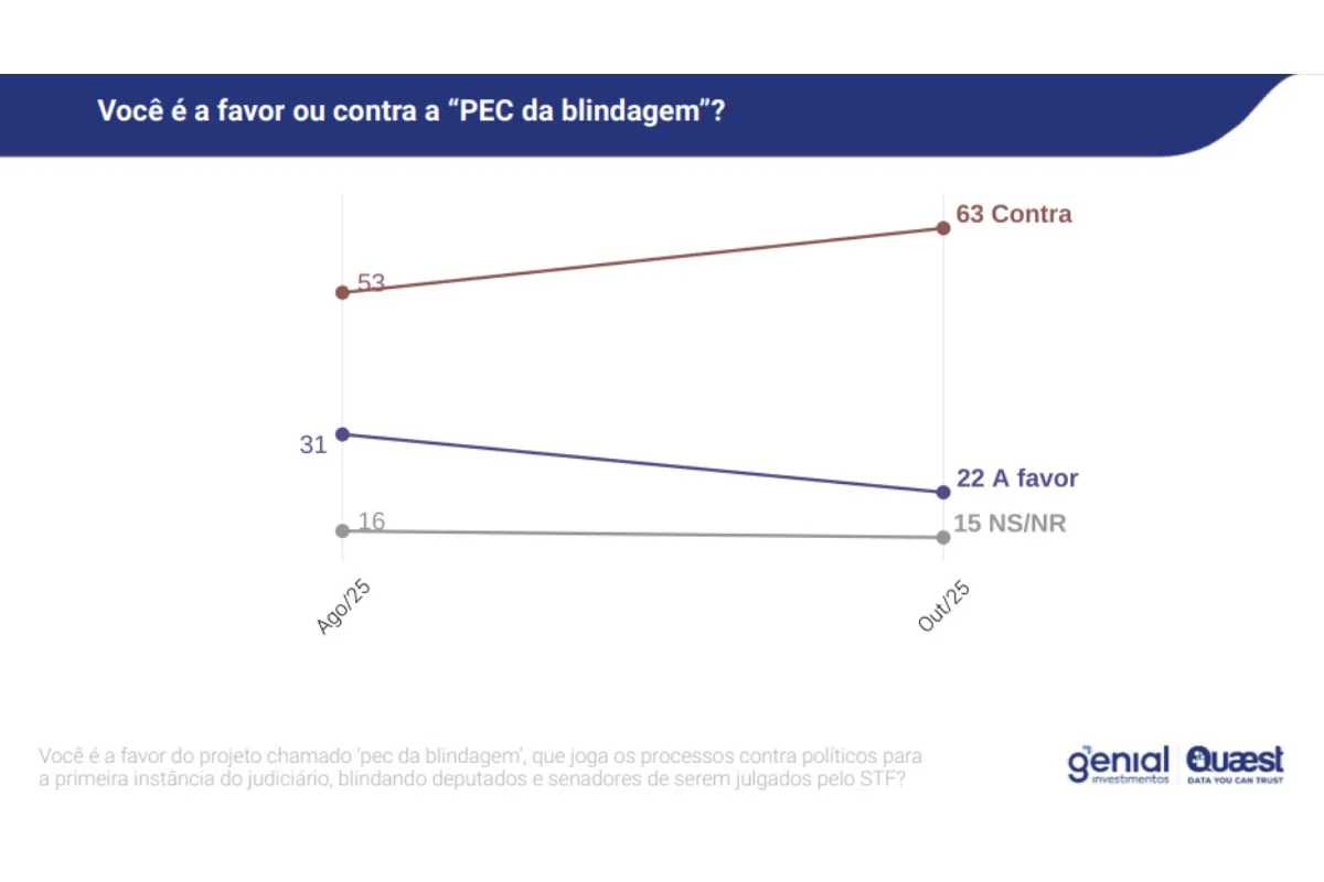 Outra proposta votada recentemente pela Câmara dos Deputados, a PEC da Blindagem, também foi avaliada pela pesquisa. Entre os que tinham conhecimento da votação (46%), 63% disseram ser contra.