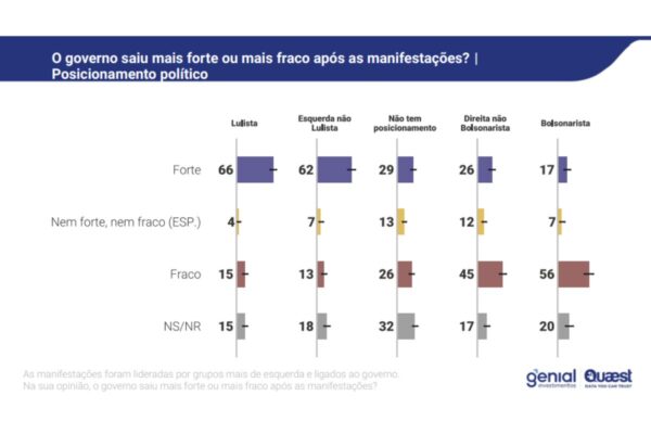 Segundo a pesquisa, 39% dos entrevistados acreditam que o governo Lula saiu politicamente mais forte após as manifestações, enquanto 30% consideram que ficou mais fraco e 22% não souberam responder.