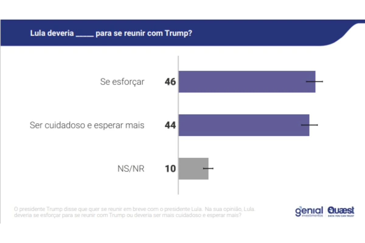 Ainda segundo o levantamento, 46% dos brasileiros acreditam que Lula deveria se esforçar para se reunir com Trump, contra 44% que acham que o presidente do Brasil deveria ser cuidadoso e esperar mais.