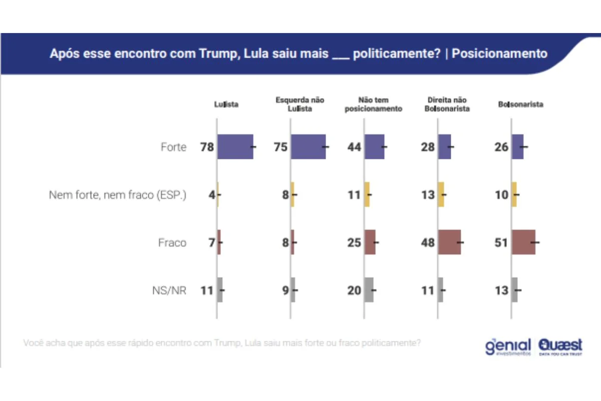Entre o grupo que se diz sem posicionamento político, 44% acreditavam que Lula saiu fortalecido pelo encontro.
