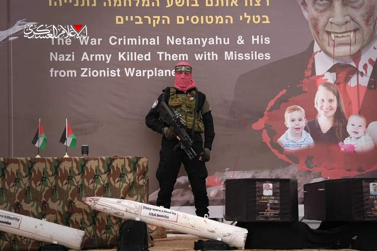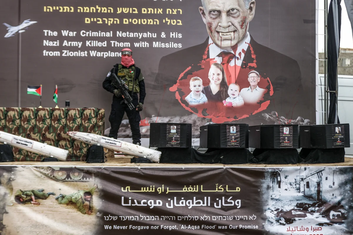 Os corpos da família Bibas (três membros) e Oded Lifshitz são entregues às equipes da Cruz Vermelha no cemitério municipal de Bani Suheila